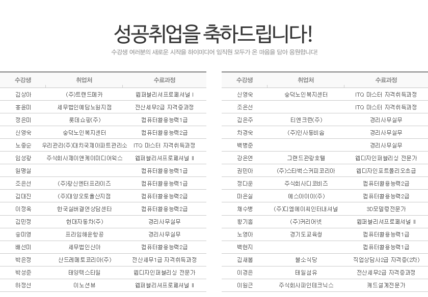 하이미디어컴퓨터학원 노원캠퍼스 2014년 11월 성공취업자 명단입니다.