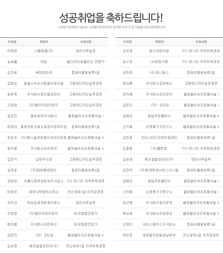 하이미디어컴퓨터학원 노원캠퍼스 2015년 1월 성공취업자 명단입니다.