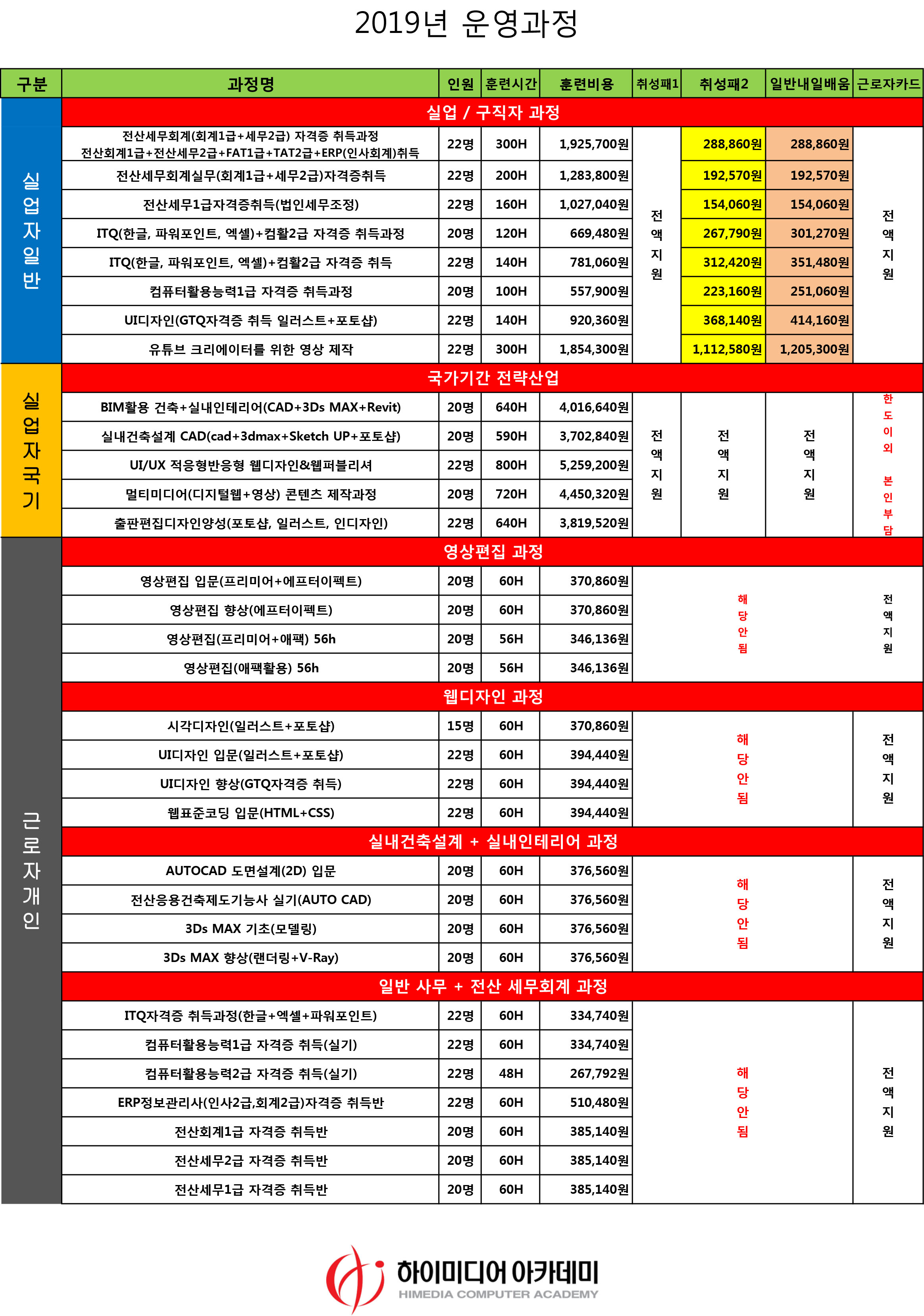 [2019년] 천호 하이미디어아카데미 컴퓨터학원 수강료 안내